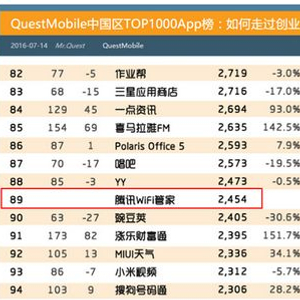 据Questmobile《中国区TOP1000App榜》数据,推出仅半年多的腾讯WiFi管家已经进入中国手机APP前100名,位居89位。据悉,腾讯WiFi管家作为市场的后来者,之所以能够迅速进入中国手机APP前100名得益于其在公共免费WiFi热点数量、安全性以及功能创新的三大优势。