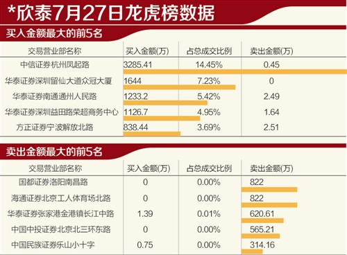 龙虎榜显示,中信证券杭州凤起路营业部27日买入*欣泰3285.41万元,华泰证券深圳留仙大道众冠大厦营业部、华泰证券南通通州人民路营业部分别买入1644万元和1233.2万元。