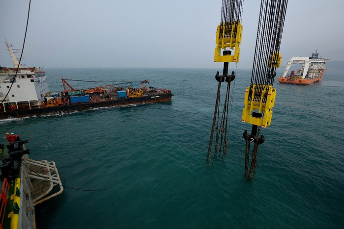 韩国当地时间7月29日,正在韩国全罗南道珍岛郡附近海域进行的“世越号”打捞工程在经过连续多日的紧张作业,于当日下午18时18分顺利完成首批托底钢梁穿引作业,这也标志着工程第二阶段作业取得圆满成功。