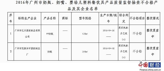 中国网财经8月4日讯 据广州市质量技术监督局官网近日消息,近期广州市质量技术监督局对本市生产领域奶瓶、奶嘴、婴幼儿塑料餐饮具产品质量进行了监督抽查,共抽取45家企业生产的88批次样品,其中塑料奶瓶37批次,玻璃奶瓶5批次,奶嘴28批次,婴幼儿塑料餐饮具18批次,经检验合格的86批次,不合格2批次,不合格产品发现率为2.27%。