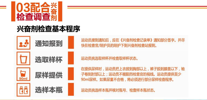 运动员在接受兴奋剂检查时,需提供不少于90毫升(EPO检查不少于130毫升)的尿样。如果不够,需启动部分尿样程序。