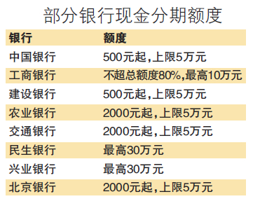 不过,北京商报记者经过调查发现,各家银行对信用卡现金分期给出的额度、费率各不相同,并且差距不小。相较而言,五大行给出的额度较低。如中行、建行现金分期最低500元起,最高上限5万元;农行、交行执行2000元起,5万元封顶的标准;工行则是“申请的现金分期额度不能超过信用卡总额度的80%,且最高不超过人民币10万元”。股份制银行方面,民生银行、兴业银行信用卡用户最高可获得的现金分期额度高达30万元。 北京银行的额度等同于农行和交行,执行2000元起、5万元封顶的标准。