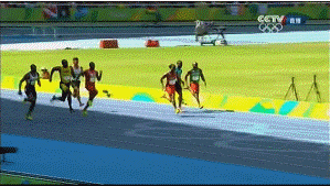 就在其他选手玩命跑的时候,博尔特边跑边回头,瞄着反超的画风再次出现......