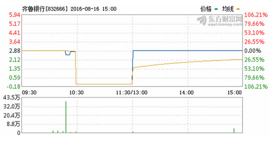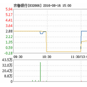 8月16日,新三板首家城商行齐鲁银行(832666)股价早盘突然暴跌99.65%,打压到0.01元/股,仅仅用了10手卖单,令人大跌眼镜,但午后回升到开盘价2.880元后维持至收盘,从K线上看是一根超长下影的T型十字星。三板虎(微信公众号:sanbanhu)从股转系统查询到,齐鲁银行出现的这笔一分钱交易发生在10点29分56秒,共计10130股(1000股/手,约10手),买卖双方都在同一证券营业部,因为股价为1分钱,所以成交金额仅为101.3元。也就是说,只要100元,就能体验一回当庄家操纵股价的快感,是不是很刺激?