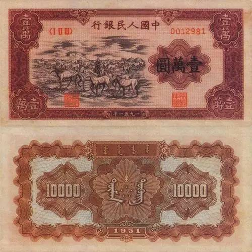 牧马币是1951年一万元中的牧马图,其正面左侧是牧马图,背面则是花纹以及蒙文的行名和面值。因为是第一套人民币中的币种,受当时的工艺限制,做工比较粗糙,并且纸张也不易保存。
