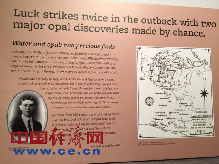 1915年1月,由吉姆·哈奇森、他14岁的儿子威廉·哈奇森、PJ·韦奇和M·麦肯组成的美国科罗拉多州探矿组来到Coober Pedy设立营地,想要寻找金矿。一个月后,金矿没有找到,年少的威廉在找水源的过程中,无意中发现了一些在太阳下闪烁着五彩光芒的石头,他拣了一小袋带回了营地,大人们惊喜地意识到,这就是欧洲王室中一直传说的最美丽的宝石—欧泊!