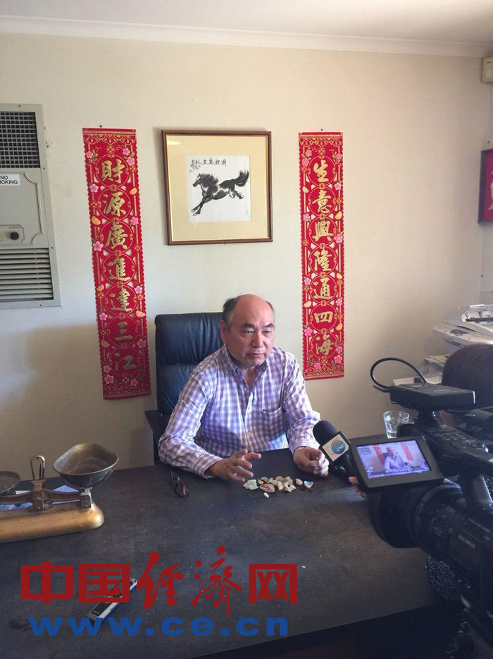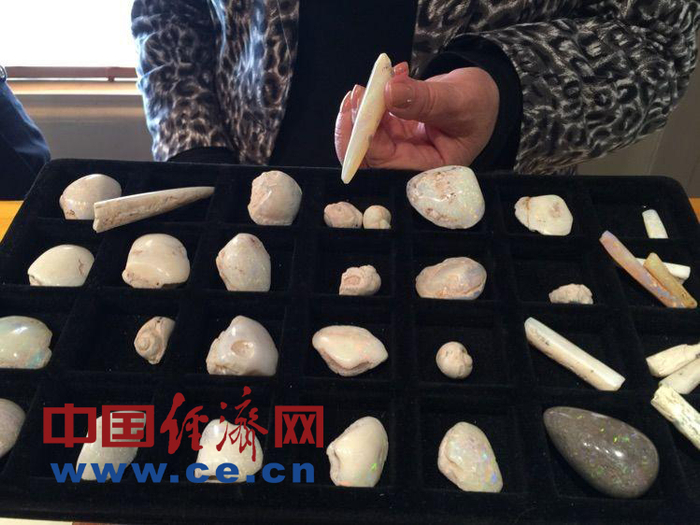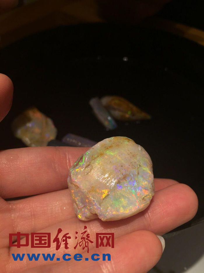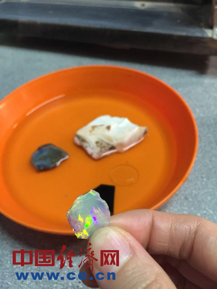 19岁就来到澳宝镇,已经从事欧泊交易40多年的香港人黄通利先生向我们介绍了欧泊的种类并传授了挑选宝石的知识。