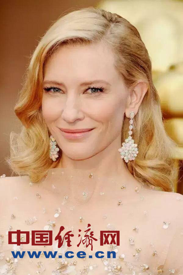好莱坞女星凯特·布兰切特 (Cate Blanchett) 佩戴镶嵌33克拉Choprad欧泊耳坠亮相第86届奥斯卡颁奖礼红毯并夺得当届最佳女主角大奖。