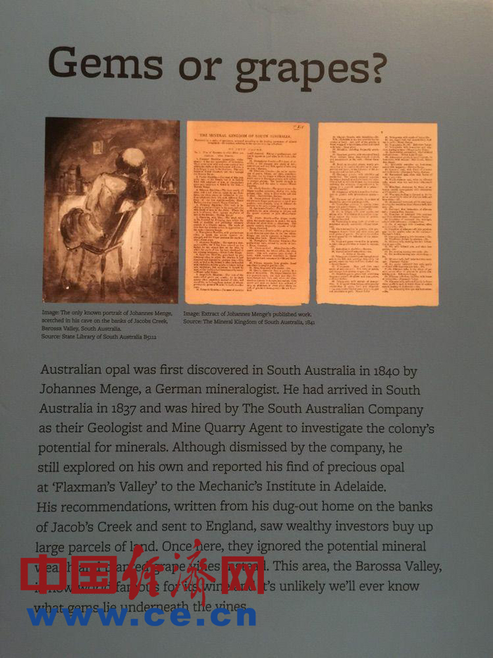 有趣的是,其实早在1840年左右,一位德国矿物学家已经在南澳大利亚发现了欧泊矿藏,他的发现吸引了欧洲大量有钱人前去澳洲南部投资土地。但当他们来到南澳以后,发现这里的气候更适合种葡萄,于是他们忘记了自己的初衷,开始大量种植葡萄。