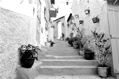 如今,蓝色的由来已经不重要了。重要的是这里的人们在这片蓝色的梦幻中静谧地生活着。穿梭在上上下下的山路间,看见奔跑的少年、闲坐的老太、懒散的猫、不停拍照的游客。他们一起,将这道蓝幻化出了更多色彩,连同这里的生活。