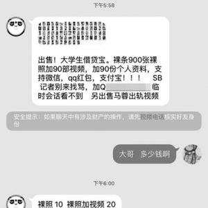 当记者以买家身份添加“裸条”借贷QQ后,对方向记者介绍,所售资料为未及时还款的大学生“裸持”照片和视频,而个人资料包括联系方式、家庭住址、学校电话及老师等详细信息。