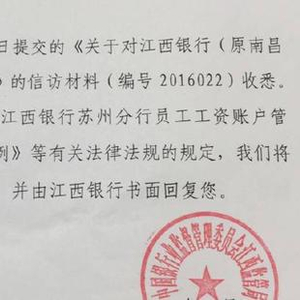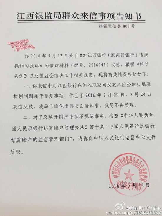 此外,她本人表示收到了江西银监局的回复,回复图片如下: