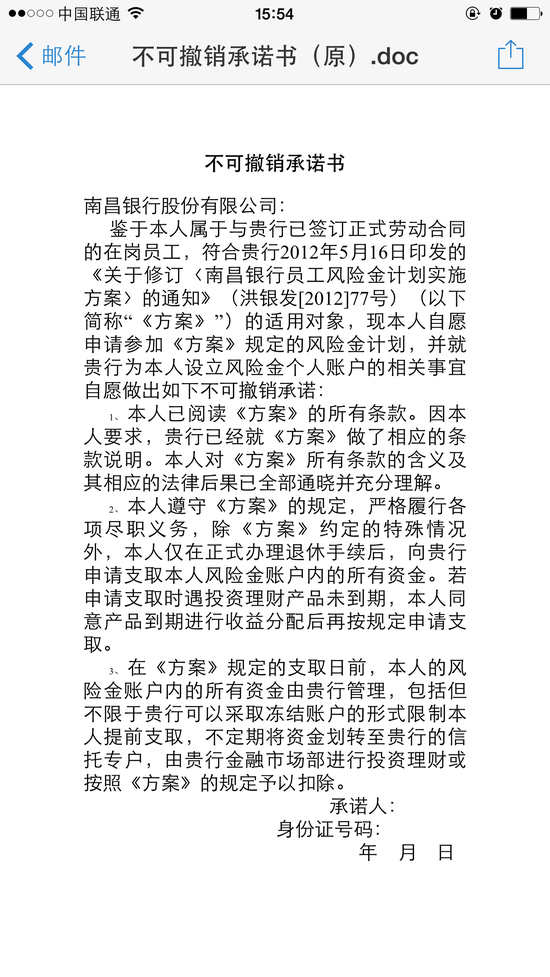 随后,江西银行总行表示,牟女士曾于2012年6月份同南昌银行苏州分行签署过一份《不可撤销承诺书》,并有牟女士本人的签字,协议自2012年6月1日生效。但牟女士向新浪财经表示其本人一直不同意签署这份协议。《不可撤销承诺书》内容如下: