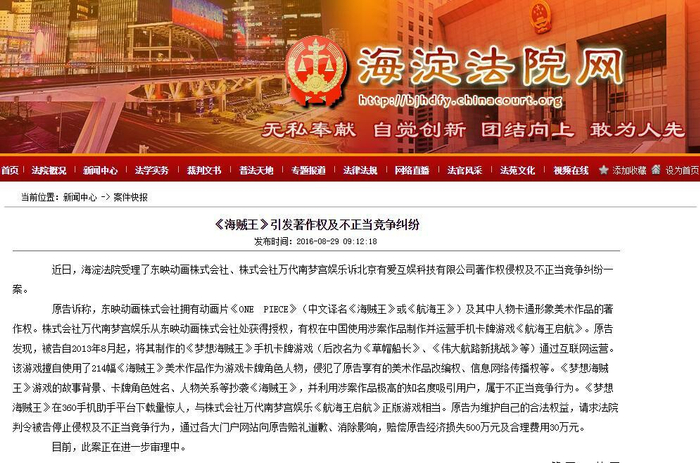 中国网科技8月30日讯(记者 张洁欣) 记者从海淀法院网获悉,东映动画株式会社、株式会社万代南梦宫娱乐日前将北京有爱互娱科技有限公司(以下简称“有爱互娱”)诉至海淀法院,认为有爱互娱旗下手游,侵犯了《海贼王》版权方享有的美术作品改编权、信息网络传播权等。