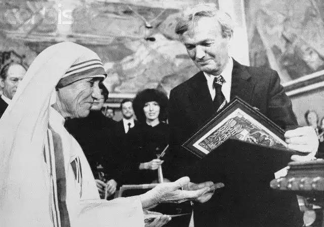 1979年因为“对于每个人生命的尊重”,她获得了诺贝尔和平奖。穿着一件常年穿着的不值1美元的印度纱丽,她走上了领奖台。