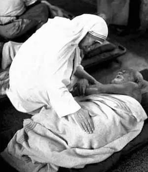 特蕾莎赶紧拿出药给她包扎,小孩却做出要吃东西的样子,特蕾莎看看自己身上仅有5卢比,便深感抱歉地说:我是个穷修女,只能帮你包扎伤口。