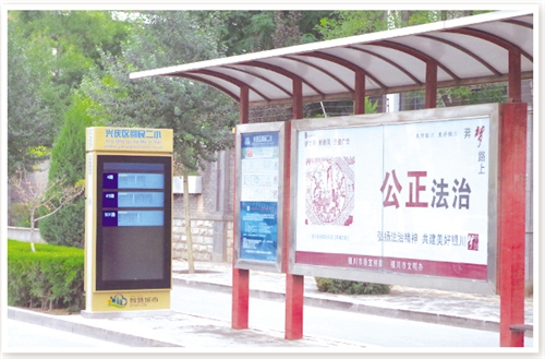 电子公交站牌发布公交车实时到站距离、预计到站时间、车上拥挤程度等信息,方便居民出行。