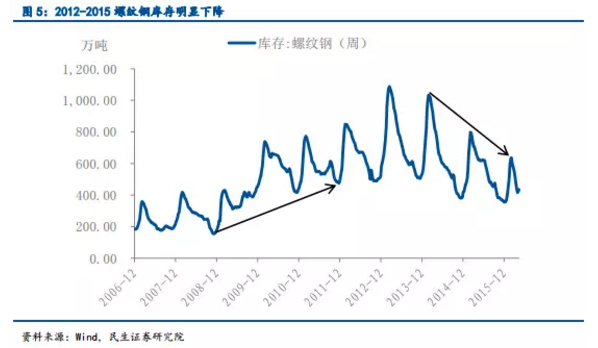 下图给出的是2006年至今螺纹钢库存量的变化情况。2008-2012年螺纹钢的社会库存经历了节节攀升的上涨周期,而从2012年开始,社会库存量触顶后开始一路下滑,库存量一度跌至09年的水平。