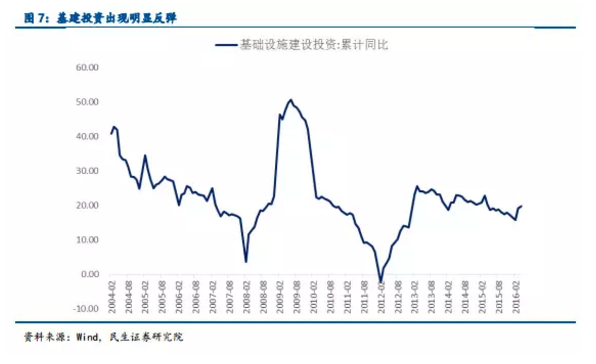 同时,基建的增量作用仍不可忽视。2016年我国的财政赤字仍具备一定的扩张空间。财政扩张不能仅看预算内的财政支出,还需将更广义的影子财政纳入。过去的城投为地方政府举债,现在的专项建设基金为中央政府加杠杆都属于此类。预计今年专项建设基金规模达到1.6万亿,考虑到资金约3倍的杠杆效应,能够撬动信贷规模约为4.8万亿。城投重新成为基建主体,政策性银行通过专项基金配套长期贷款的方式引导城投公司加快投资,逐步唤醒由于前期过度融资但项目不足而趴在账上的资金。
