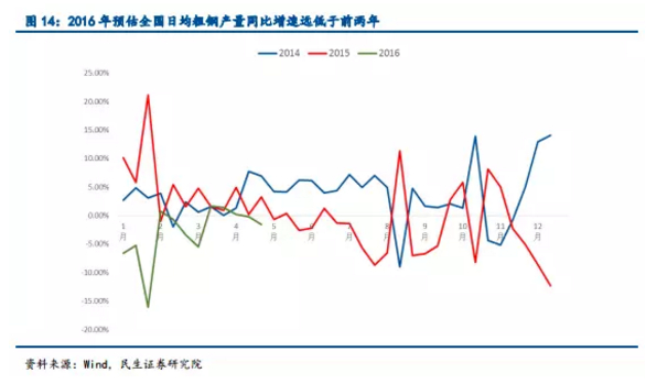 2、钢厂复工仍然较慢。由于市场对需求的可持续性存在分歧,生产厂商对行情的判断存在差异,叠加前期的亏损,螺纹钢价格的回升和利润的好转并不能立刻带动企业重新大规模开工,生产虽有恢复但速增较慢。从粗钢日均产量指标来看,今年4月以来钢厂开工率恢复缓慢,粗钢日均产量增速远低于2014和2015年同期水平。部分钢厂通过提高入炉品位、增开电炉、前期停产钢厂复产等方式持续释放产能。