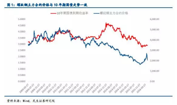 基于以上特点,螺纹钢与实体经济和资本市场的关系非常密切。就债券市场而言,螺纹钢主力合约价格与10年期国债走势具有高度的一致性。
