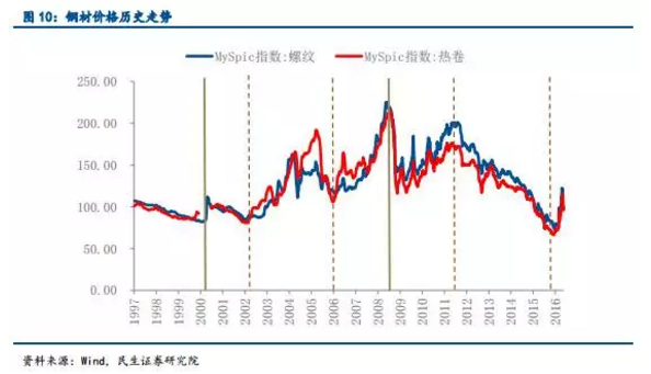 钢铁行业是推动经济增长的动力源泉,钢材市场需求的发展变化是宏观经济发展变化的缩影。1992-1999年,我国实行价格双轨制,能拿到钢材就能在市场上获得丰厚的收益。92年3月钢铁行业出现高点,并在东南亚金融危机后开始进行下行通道。2000-2009年,钢材价格基本实现市场化,04-06年属于消化前期刺激政策的阵痛阶段,之后钢价强势上涨,直到受美国次贷危机影响,钢铁产量跌入历史性地点。2009年中国释放4万亿流动性以对抗金融危机,经济逐渐企稳,钢材价格开始震荡上行。由于大规模刺激带来的产能过剩、企业负债高企、通胀抬头等问题,政府开始调控房市,房地产市场的调整直接传导到中上游钢铁厂商的去杠杆周期,从2011年开始整个黑色产业链的熊市因自下而上的产能淘汰而开启。