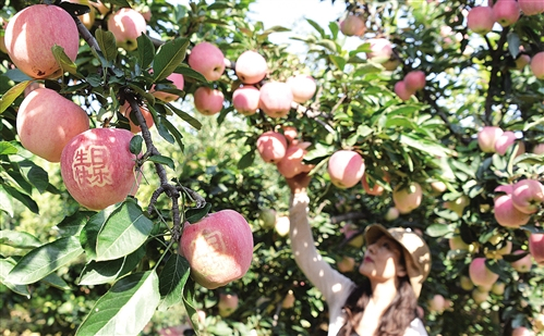 河北望都县固店镇七里铺村苹果园里果实挂满枝头。该县上万亩苹果、葡萄陆续进入收获期,吸引各地游客前来观光、采摘。 陈卫红摄