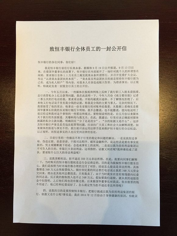 我是恒丰银行前任行长栾永泰。据媒体9月19日公开报道,9月13日以来,在蔡国华董事长的部署下,恒丰银行在内部展开了一场针对我个人的所谓签名闹剧,要求银行全体1.1万名员工揭发我栾永泰所谓罪行,并召开党委扩大会议,传达“认清栾永泰团伙的本质”、“栾永泰及利益团伙目的就是想将恒丰银行据为己有,成为私人财产”等内容,对我本人名誉造成极大伤害。为澄清事实,以正视听,特就此发表一封致全行员工的公开信。
