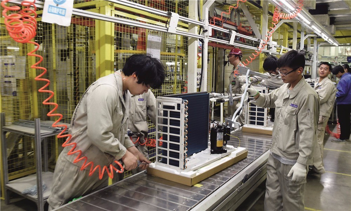 工人正在海尔空调生产线上作业。
