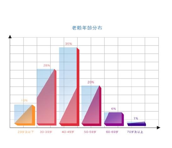 从老赖的性别比例来看,男人比女人更不靠谱。男性老赖约占老赖总人数的四分之三,是女性老赖的三倍。从年龄分布看,40~49岁的中年人最容易陷入信用危机成为老赖,占35%。