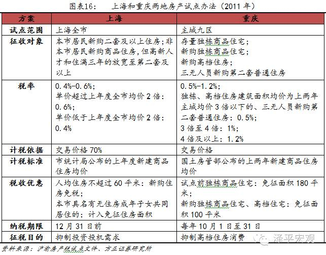 上海和重庆的试点方案应该是未来全国推广房产税的重要参考方向,他们主要具有以下几点共同点:1)征税重点以新增购房为主,同时,买高价房就要交更多的税;2)差别化税率。上海有两档,重庆有三挡,控制高档住房的比例;3)较为宽松的免税政策。这样可以减少因为房产税对居民的基本住房需求的侵害;4)限制外来的投资需求。根据是否为本地居民采取不同征税条件。