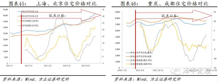 从我国上海、重庆试点征收房产税后的市场情况看,2011年1月28日开始试点后,两市商品住宅成交量价均未走出独立行情。同时,房产税试点也并未改变沪渝两市短周期波动特征:上海作为一线城市房价涨速大幅跑赢全国水平,2010年开始严格实施的限购措施也导致成交量波动较大;重庆因为供应充足、城镇化和整体收入水平较低、独特的组团式城市布局,房价涨速低于二线城市水平,投资投机性需求小,因此成交量波动也明显较小。波动幅度房价基本面主要受置业人口、经济增长以及城镇化进程因素影响。