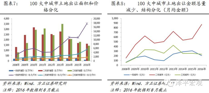 我国广大三四线城市、中西部地区和资源型城市圈存在较高库存泡沫。用完工待售面积表示狭义库存,用累计开工减去累计销售表示广义库存,两者都一路走高,在2016年上半年才开始回落。目前去库存大幕刚启,任务依然很重,去库存将是持久战。商品房、商品住宅广义库存面积分别为59.3亿平、26.8 亿平,较2015年12月,分别增加1.7亿平、减少0.3亿平。按照1-7月月均销售面积计算,7月末,商品住房和商品住宅广义库存的存销比分别为54.8个月和27.9个月。因此,即使不新增加开工面积,并保持当前销售速度,商品房和商品住宅广义库存也需要4.5年和2.4年才能完全消化。另一方面,库存区域分化明显,考虑到一线和强二线上半年库存下降快,对去库存贡献较大,三四线城市和中西部地区去库存任务仍然严峻。