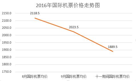 其中,2016年“十一”期间的国内航线单程票价虽比8月均价下降了55.5元,却比9月高出129元。国际航线机票价格呈下降趋势,8月国际航线的单程机票价格在2118.5元,9月就下降了95元,到现在为止,“十一”的国际航线单程机票均价跌破2000元,到了1889.5元。