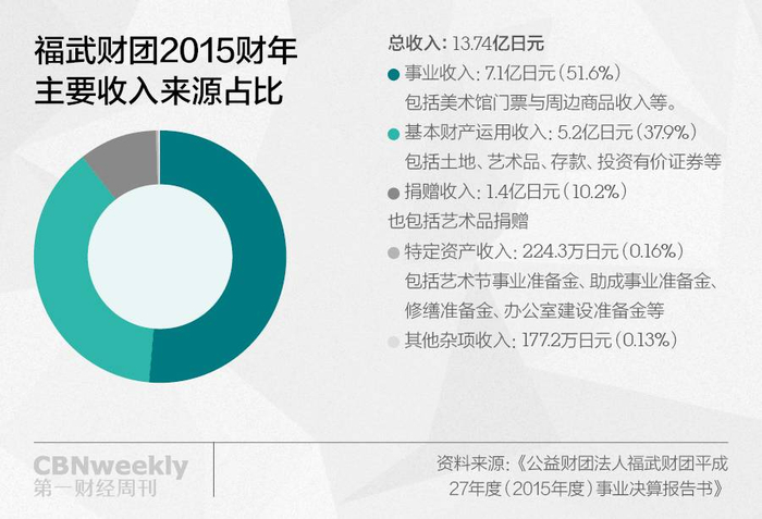 福武财团不仅负责位于直岛的地中美术馆、李禹焕美术馆、直岛钱汤,以及部分“家·项目”等项目的运营,还负责运营濑户内海其他几个岛屿共计17个艺术项目,另外,濑户内海有13处美术馆商店、餐厅与关联商品销售也由它负责。2015财年,福武财团美术馆门票及关联商品销售额约7.1亿日元(约合4592万元人民币),超过财团总收入的一半。
