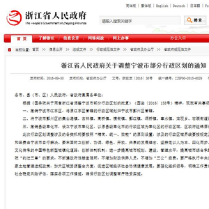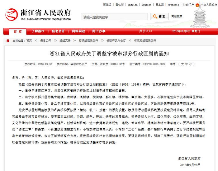 《通知》称,根据《国务院关于同意浙江省调整宁波市部分行政区划的批复》(国函〔2016〕158号)精神,就有关事项通知如下: