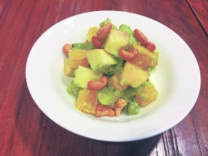 善在·金鼎轩(望京店)的菜单类似杂志,每道菜不仅有中、英、韩文的菜名,还标注了所用的食材及每100克的营养成分表。但菜单上基本以小吃为主,可选菜品偏少,难怪邻桌一位中年男子抱怨“没什么可点的”,落座后又拉着家人离开了。实际体验了几道菜品,牛油果酱沙拉值得推荐,水果搭配新鲜的牛油果酱,上面点缀大颗腰果,美味又爽口。榛蘑炒柴鸡蛋里的鸡蛋颜色很淡,没有菜单照片中那种诱人的金黄色,且油偏大。宜宾燃面适合重口味者,辣油把面拌得红彤彤,盖了一半干果碎一半碎米芽菜,又香又辣,很过瘾,但分量偏小。