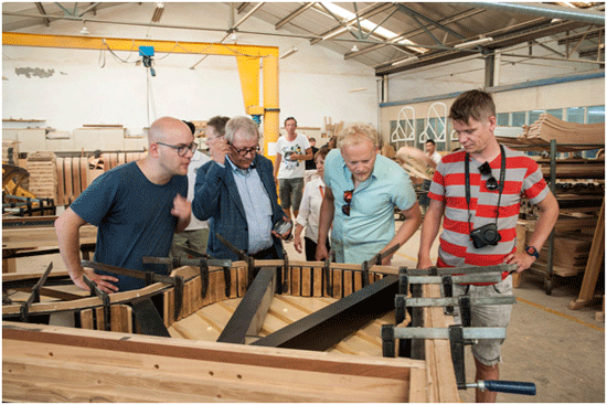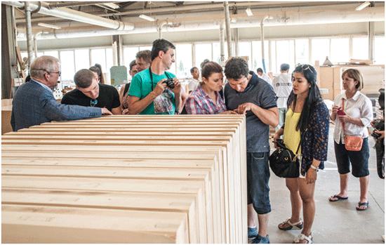 波尔先生向外宾介绍立式钢琴背架的生产工艺