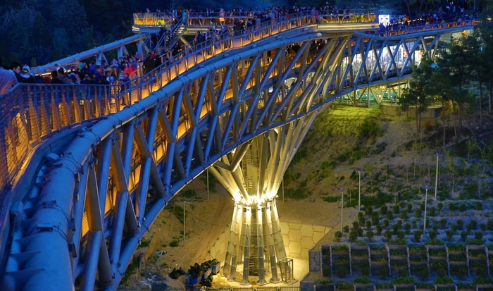 人行天桥横跨下方繁忙的高速公路,两端连接两个被公路隔开的公园。“桥”暗示过程,设计师将“目的地”的意义赋予这座天桥。它不仅连接了分离的绿地,还成为德黑兰重要的公共空间。天桥共有三层,分布着咖啡厅、画廊和餐厅。黄昏时分,绿植中灯光亮起,城市中的个体在这里相聚,而不只是路过。Tabiat在波斯语中有“自然”之意,这座桥也使人自然驻足。
