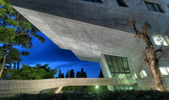 这座全新建筑设计激进,同时表达出尊重传统情境的理念。建筑第三、四层似漂浮于空中,大体量的悬挑结构位于入口庭院上。庭院内原有的古树得以保留,并成为决定建筑高度的重要依据。同时,墙面角度和窗户设计使阅览室、会议室和工作室靠近古树及枝叶,既与地形契合,又与附近景观融合。材料选择方面,这座建筑是20世纪黎巴嫩清水混凝土建筑文化的延续。此外,作为研究公共政策和国际事务的学院,它的设计也体现中立性、公众性和开放性,研究者可以在这个空间内相聚畅谈。