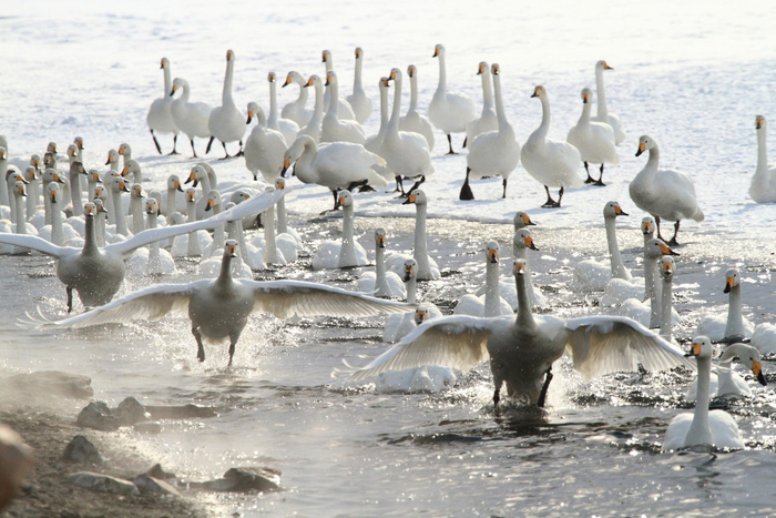 天鹅属国家二级重点保护动物,喜欢群栖在湖泊的沼泽地带,以水生植物为食。