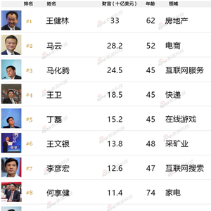 在这张榜单上,万达集团总裁王健林以330亿美元高居榜首。马云和马化腾以282、245亿美元分列第二、三位。顺丰速递总裁王卫以185亿美元排在第四,网易的丁磊以152亿美元排在第五。正威国际集团的创始人王文银以138亿美元排在第六,百度的李彦宏以126亿美元排在第七,美的集团创始人何享健以114亿美元排在第八,恒大地产创始人许家印以98亿美元排在第九,宝能投资集团的董事长的姚振华以95亿美元排在第十。