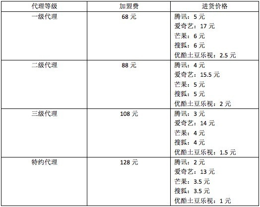 该代理告诉北京时间记者:“交的加盟费越多,代理等级越高,进货价格就越便宜,如果做特约代理,除爱奇艺以外,其它网站的会员都只要两三块钱。”