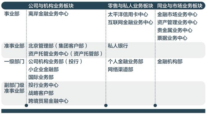 除个人原因,公司和同业板块的变化,背后实则牵动着交行新一轮机构和事业部调整。继投行部被并入公司部,交行正从公司业务板块切入,推动副部门级准事业部以及分行准事业部制改革。