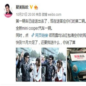 在双十一如此临近的时间,陈欧接连送出粉丝两辆MINI轿车,想必这事绝非偶然。的确,聪明的陈欧显然清楚,在双十一期间与“猫狗”硬拼不见得是个正确的决策,于是选择在个人微博里抽奖送粉丝汽车,简单的一个转发就有可能得到价值30万的汽车,面对如此大的诱惑粉丝自然不会轻易错过,根据前两次瞅车微博每条上亿次的曝光来看,陈欧显然是走对了路子。