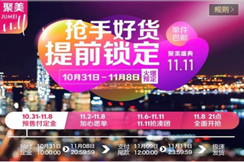 谈及有关双十一的大促计划,聚美优品目前已经确定了此次的大促力度。据了解,聚美已于10月31日开启了预售付定金的通道,并于11月8日21点正式开始本次大促的售卖。主会场力度全场满199减100返200,更有专场低至11.11元,爆款尖货也是5折发售,力度之大相信消费者不心动也难。