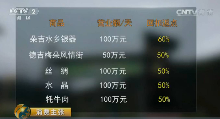 按照这份表格计算,朵吉水乡每天的营业额100万,返点60%,德吉梅朵风情街每天营业额50万元,返点50%,丝绸、水晶、牦牛肉等购物店每天营业额100万,返点50%。