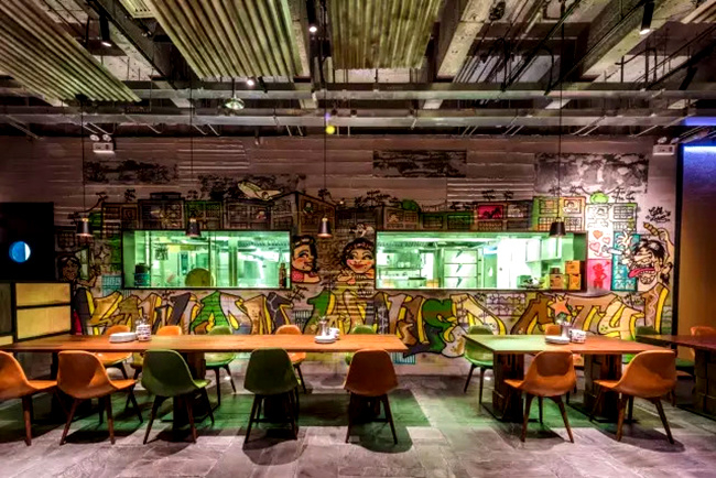 成名于香港的梁经伦自然不会错过这个有意思的“罪恶据点”。Daimon Bistro的入口是一扇深褐色的铁门,从暧昧的紫色灯光开始,破旧的木板墙、模仿脚手架搭起的竹吧台、陈旧的电表、半开放式厨房外的涂鸦墙,连客人的衣帽间都被设在铁网区域内……每个细节似乎都是九龙城寨的缩影。