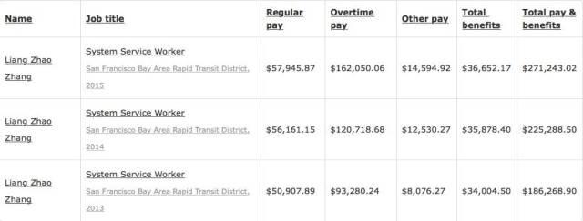 BART公司似乎很舍得在员工身上花费重金。其实不止张良朝,去年收入在14.8万美元(即人民币百万元)以上的地铁清洁工总计有11位,只不过张良朝位居第一罢了。紧随张良朝其后的Yiu Fai Ko去年也有高达22万美元的收入。当然,他们也要加班!