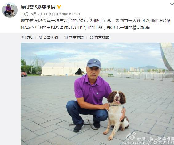 李维福被称为“犬王”,在警犬驯导岗位奋斗了40年,开创了中国公安血迹搜索犬技术先河,成功培育了四代血迹搜索犬,“草根”是他培养的第三代。